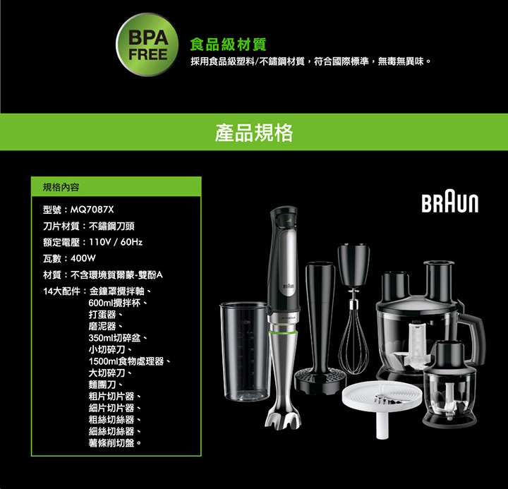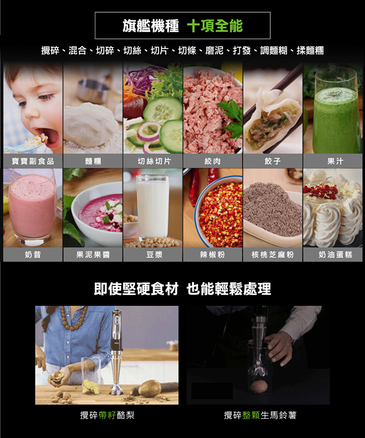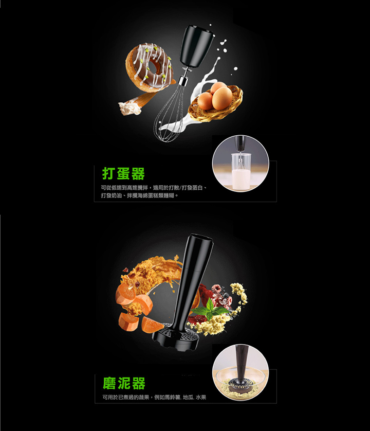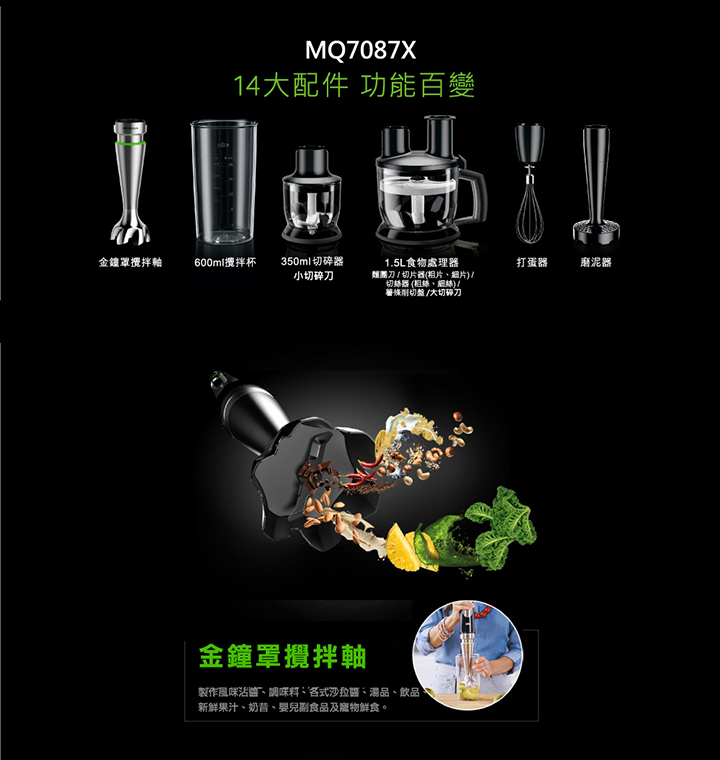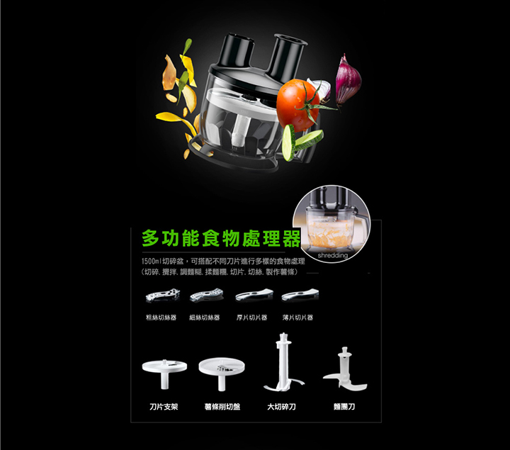 ■ 14大配件:攪拌軸、600ml攪拌杯、打蛋器、磨泥器、350ml切碎盆、小切碎刀、1500ml食物處理器、