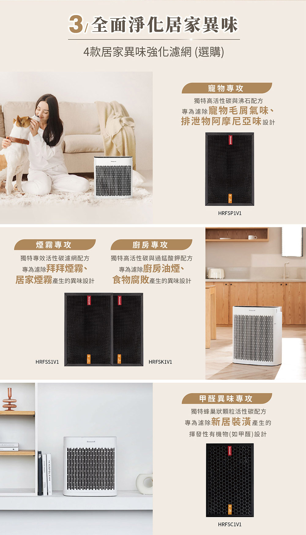 ●如欲加強淨味效果,可加購強效淨味濾網:HRFSS1(煙霧)、HRFSC1(家居裝修)、HRFSK1(廚房)、HRFSP1(寵物) (需另購2片,建議3個月更換一次)