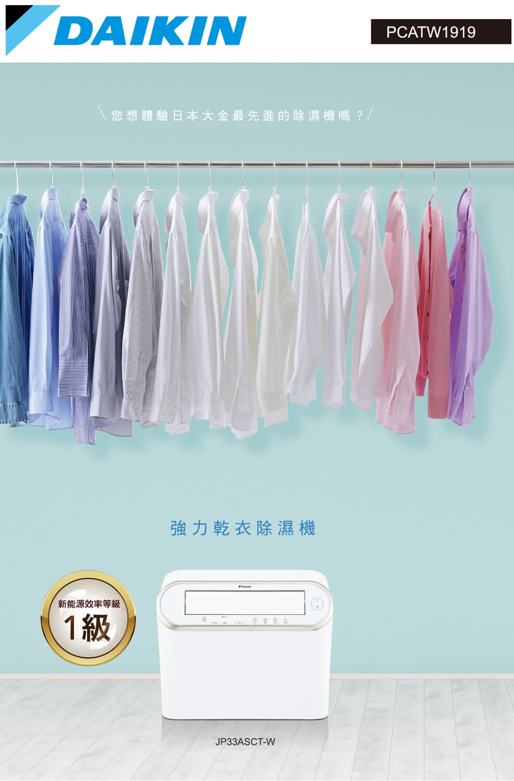 【大金 DAIKIN】【效率等級1】 16.5L 3級強力乾衣電眼感應除濕機 JP33ASCT-W