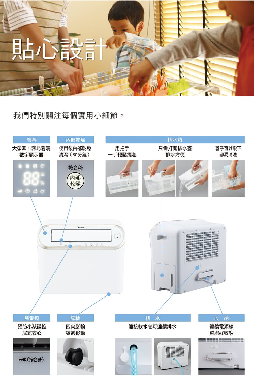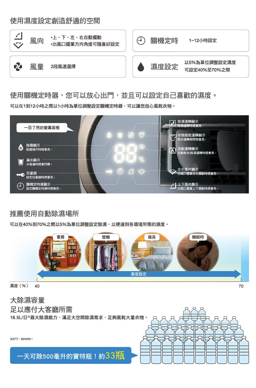 特殊功能:定時功能, 衣物乾燥, 連續除濕, 濕度設定除濕