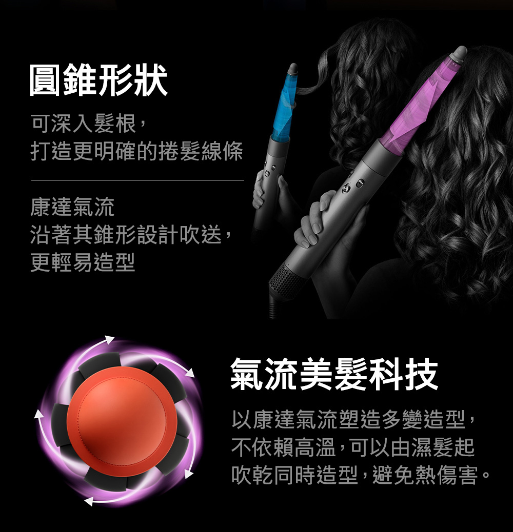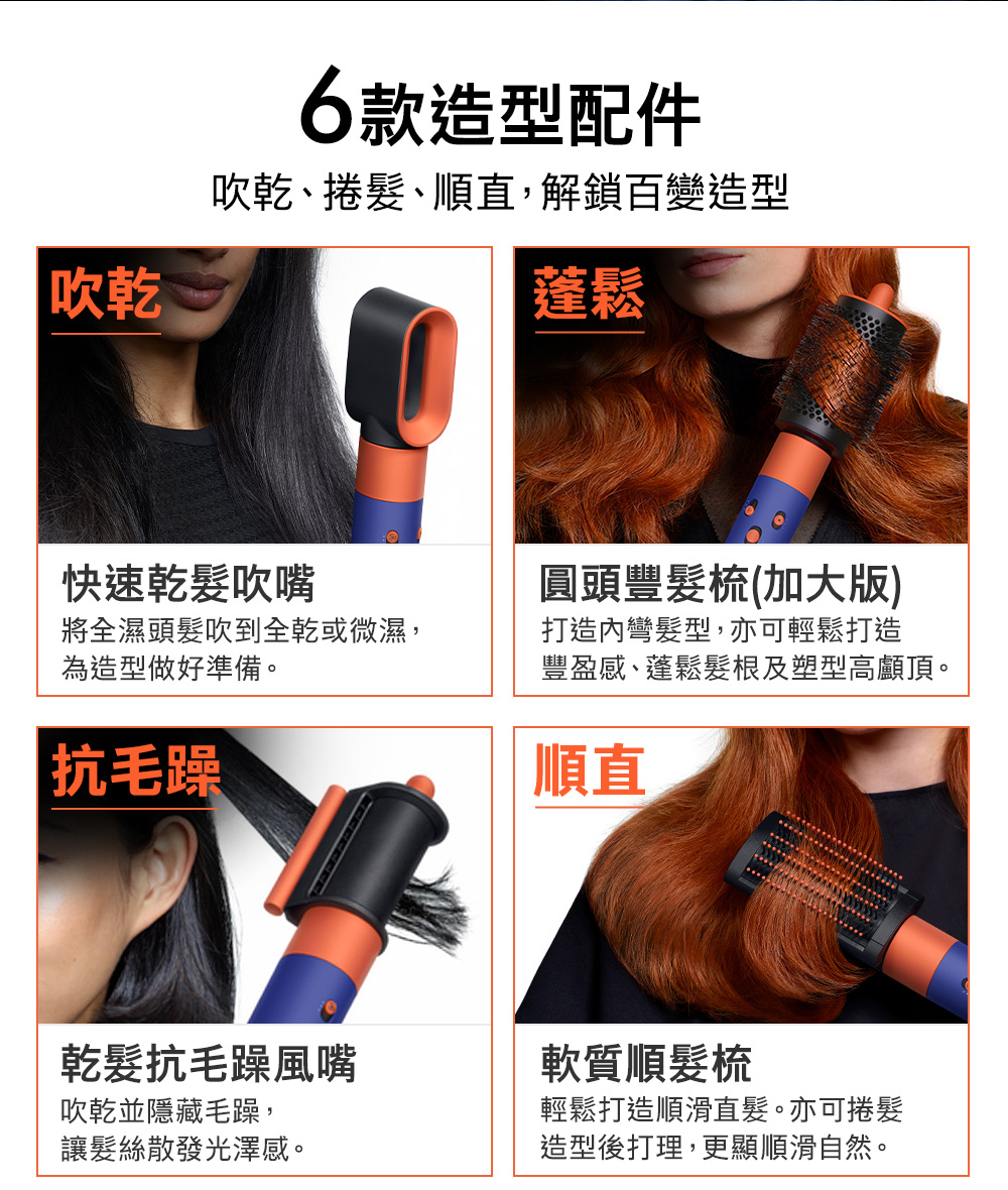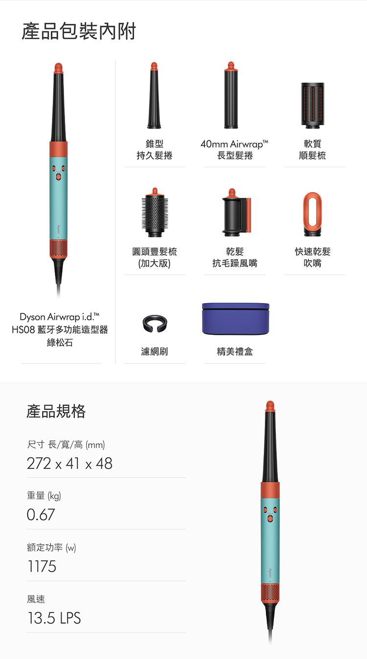 內附配件:快速乾髮吹嘴、圓頭豐髮梳(加大版)、乾髮抗毛躁風嘴、軟質順髮梳、錐形持久髮捲、40mm Airwrap長型髮捲、濾網刷、禮盒