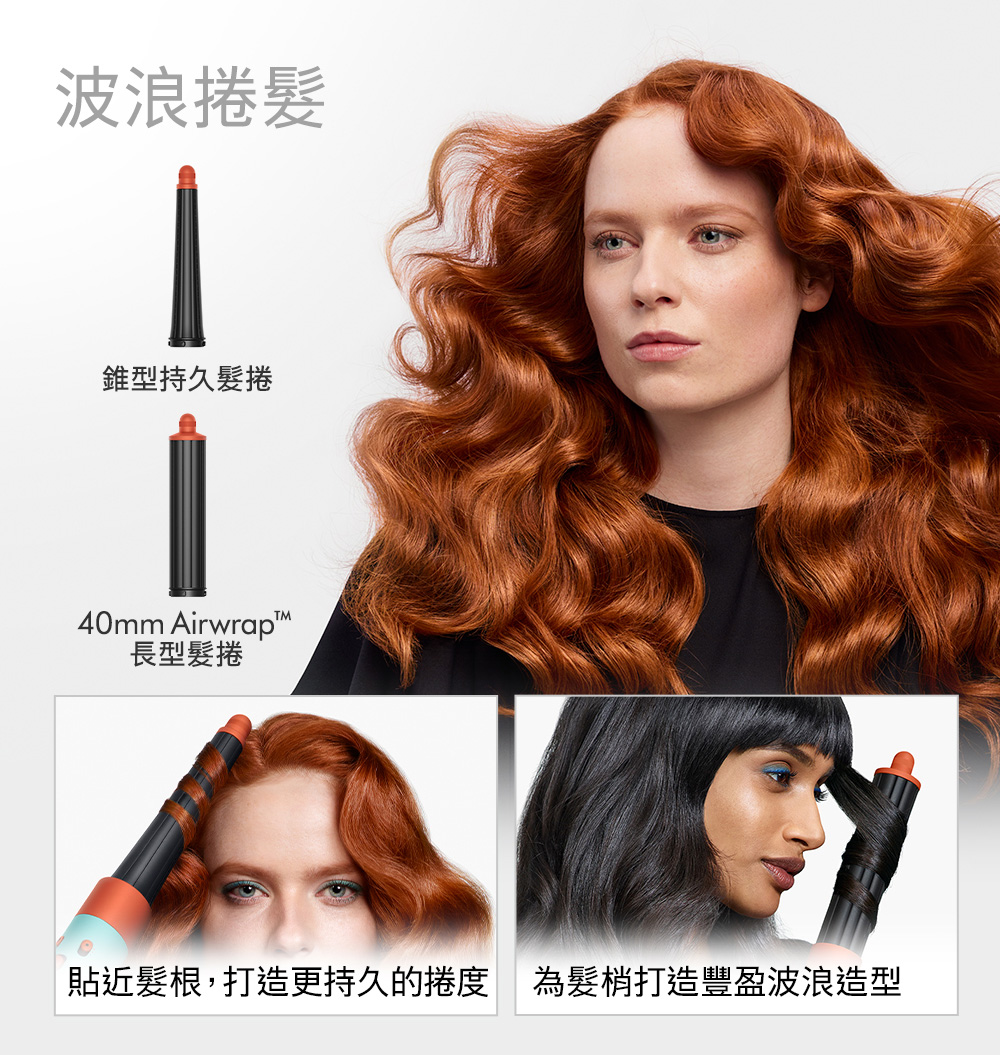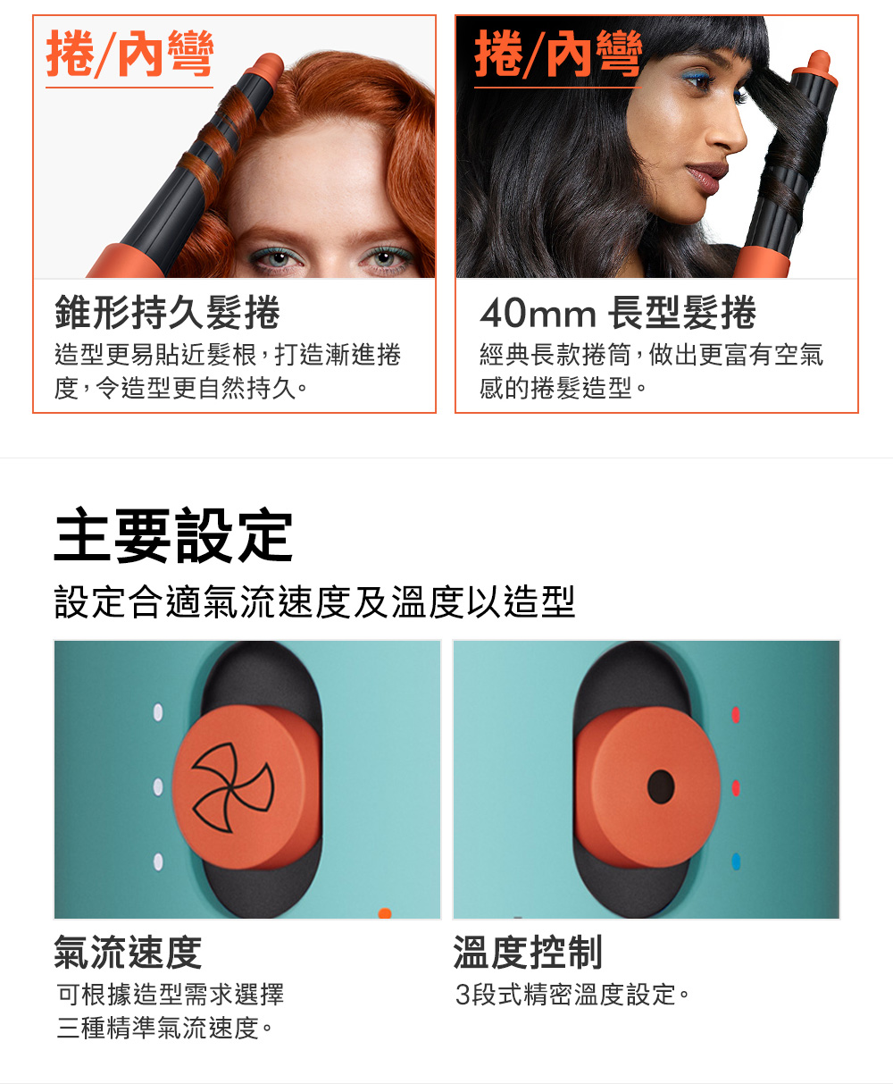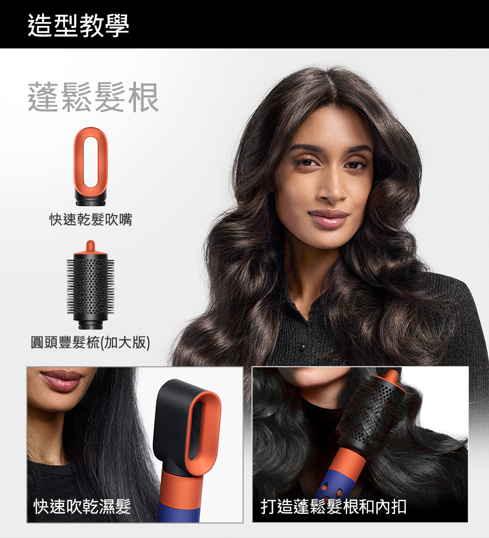 內附配件:快速乾髮吹嘴、圓頭豐髮梳(加大版)、乾髮抗毛躁風嘴、軟質順髮梳、錐形持久髮捲、40mm Airwrap長型髮捲、濾網刷、禮盒