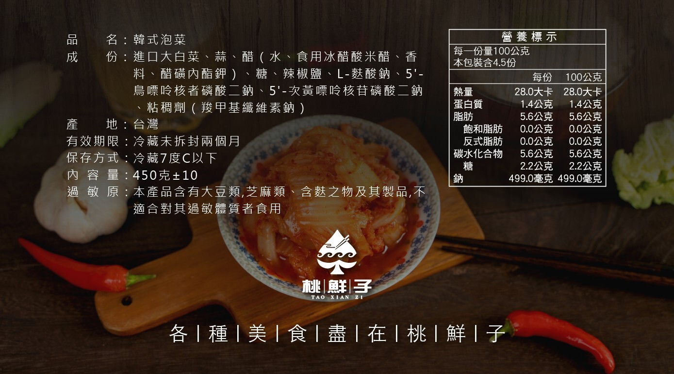 以大白菜為主要原料,使用韓式辣醬、蒜、薑等醃製發酵,味道酸辣爽脆。