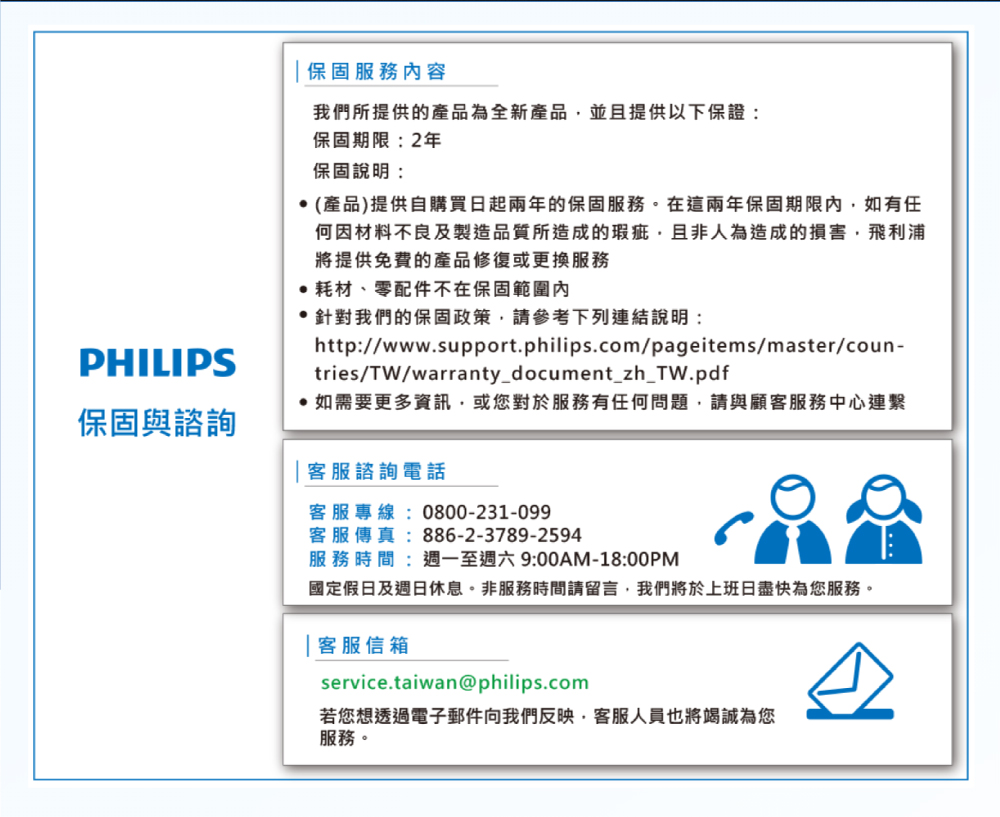 飛利浦客戶服務專線:0800-231-099 (週一至週六 09:00 - 18:00)