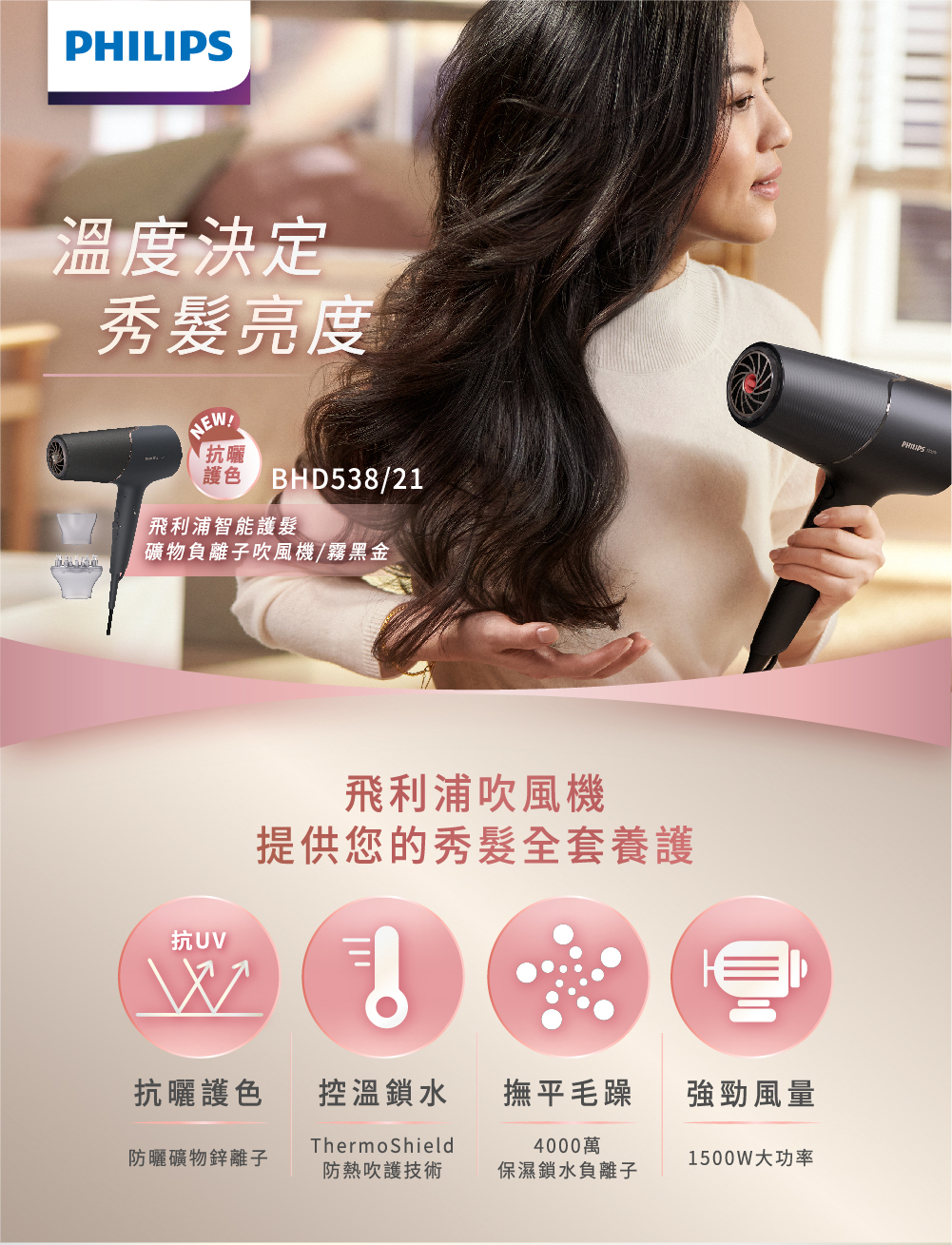【PHILIPS 飛利浦】智能護髮礦物負離子吹風機-霧黑金 (BHD538/21)